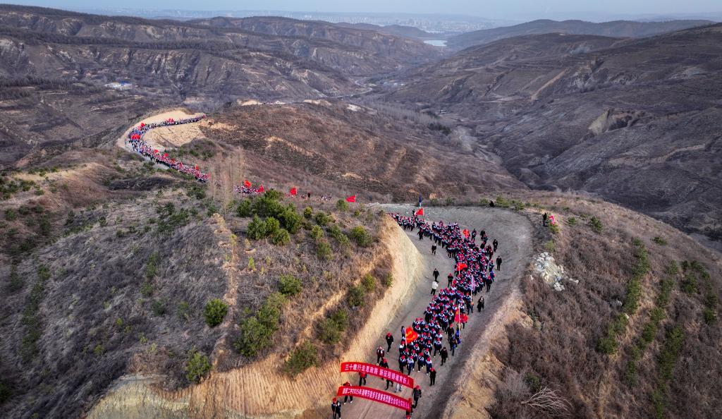 4月3日,參加徒步祭英烈活動(dòng)的師生在翻越黃峁山(無(wú)人機(jī)照片)。