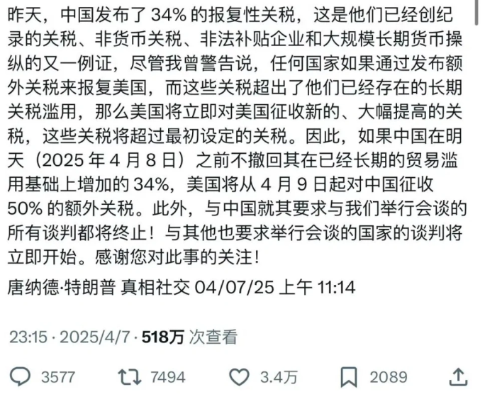 一覺醒來(lái),特朗普再發(fā)威脅,警告中國(guó)在4月8號(hào)前取消報(bào)復(fù),不然4月9號(hào)就對(duì)中國(guó)再加50%額外關(guān)稅,此外所有和中國(guó)的談判都會(huì)中止,而和其他國(guó)家的談判將立即開始。