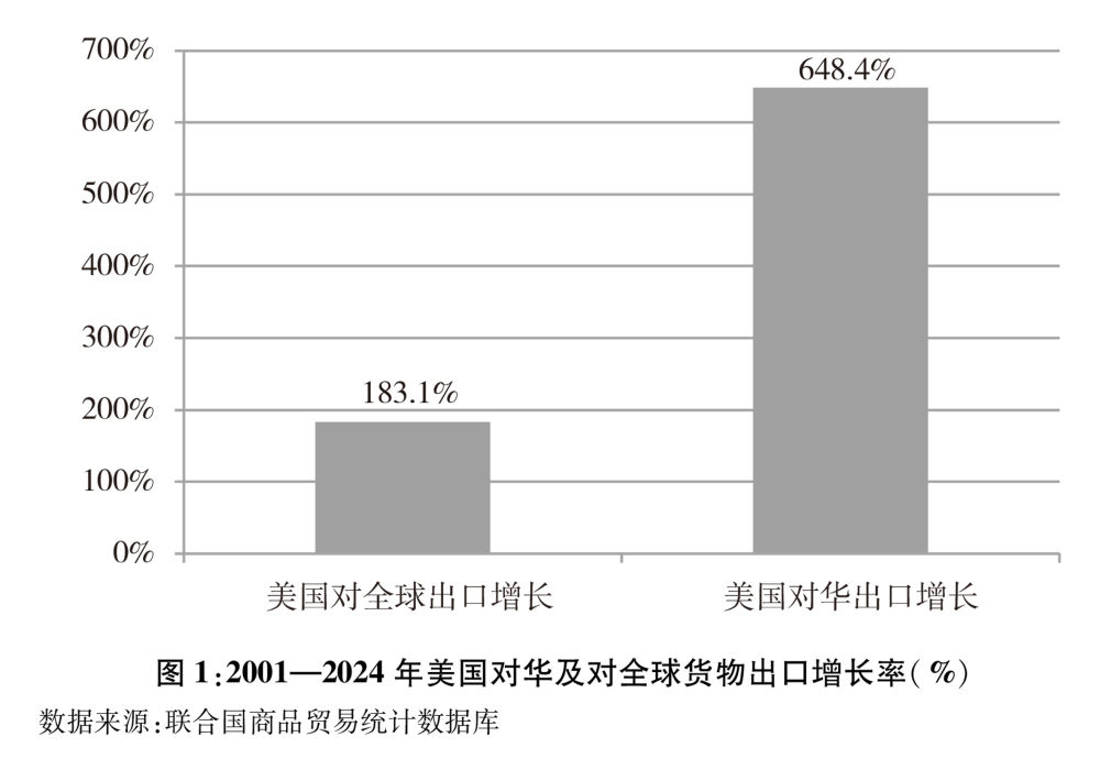 美國(guó)對(duì)華出口增速明顯快于其對(duì)全球出口。中國(guó)加入世界貿(mào)易組織以來(lái),美國(guó)對(duì)華出口快速增長(zhǎng),中國(guó)成為美國(guó)重要的出口市場(chǎng)。根據(jù)聯(lián)合國(guó)統(tǒng)計(jì)數(shù)據(jù),2024年美國(guó)對(duì)華貨物出口額1435.5億美元,較2001年的191.8億美元增長(zhǎng)648.4%,遠(yuǎn)遠(yuǎn)高于同期美國(guó)對(duì)全球183.1%的出口增幅(圖1)。