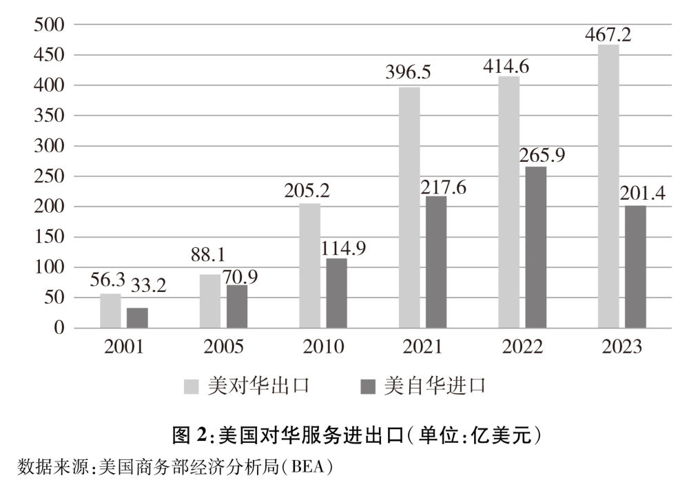 美國(guó)服務(wù)業(yè)產(chǎn)業(yè)門(mén)類(lèi)齊全,具有較強(qiáng)國(guó)際競(jìng)爭(zhēng)力??傮w來(lái)看,隨著經(jīng)濟(jì)不斷發(fā)展和人民生活水平提升,中國(guó)對(duì)服務(wù)需求明顯擴(kuò)大,中美雙方服務(wù)貿(mào)易快速增長(zhǎng)。據(jù)美國(guó)商務(wù)部統(tǒng)計(jì),2001-2023年,中美服務(wù)貿(mào)易額由89.5億美元擴(kuò)大到668.6億美元,增長(zhǎng)了6倍(圖2)。根據(jù)中方統(tǒng)計(jì),2023年,美國(guó)是中國(guó)第二大服務(wù)貿(mào)易伙伴;據(jù)美方統(tǒng)計(jì),中國(guó)是美國(guó)第五大服務(wù)出口目的地。
