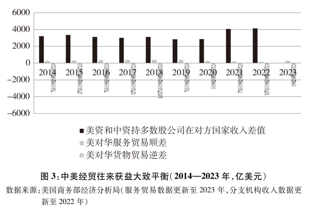 根據(jù)美國(guó)商務(wù)部數(shù)據(jù),2023年美國(guó)對(duì)華服務(wù)貿(mào)易順差為265.7億美元,美國(guó)在服務(wù)貿(mào)易方面占有顯著優(yōu)勢(shì);2022年美資企業(yè)在華銷(xiāo)售額高達(dá)4905.2億美元,遠(yuǎn)高于中資企業(yè)在美786.4億美元的銷(xiāo)售額,差額高達(dá)4118.8億美元,美國(guó)企業(yè)跨國(guó)經(jīng)營(yíng)優(yōu)勢(shì)更為突出。