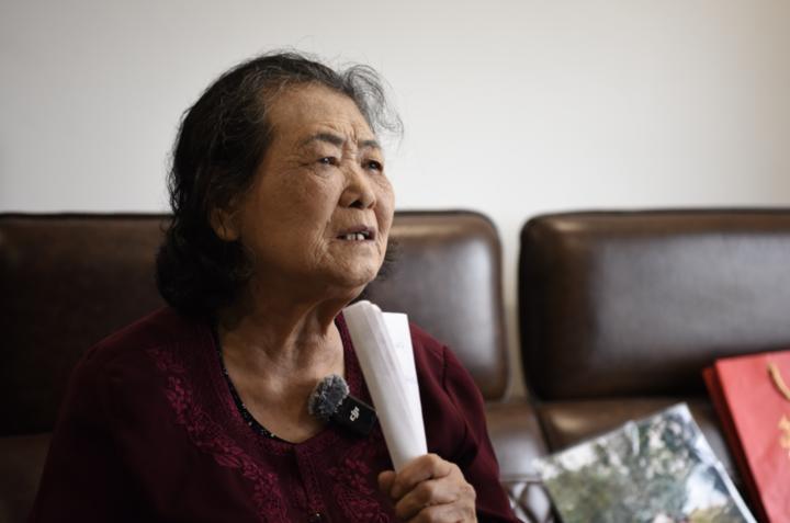 采訪中,陳明月老人把紙卷成“麥克風(fēng)”向記者演唱《康定情歌》。新華社記者宿亮攝