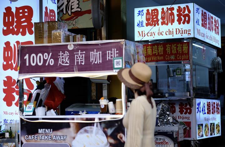 這是在中國(guó)東興口岸拍攝的街景。中越兩國(guó)游客在這里品嘗特色美食、咖啡。新華社記者鄭開君攝