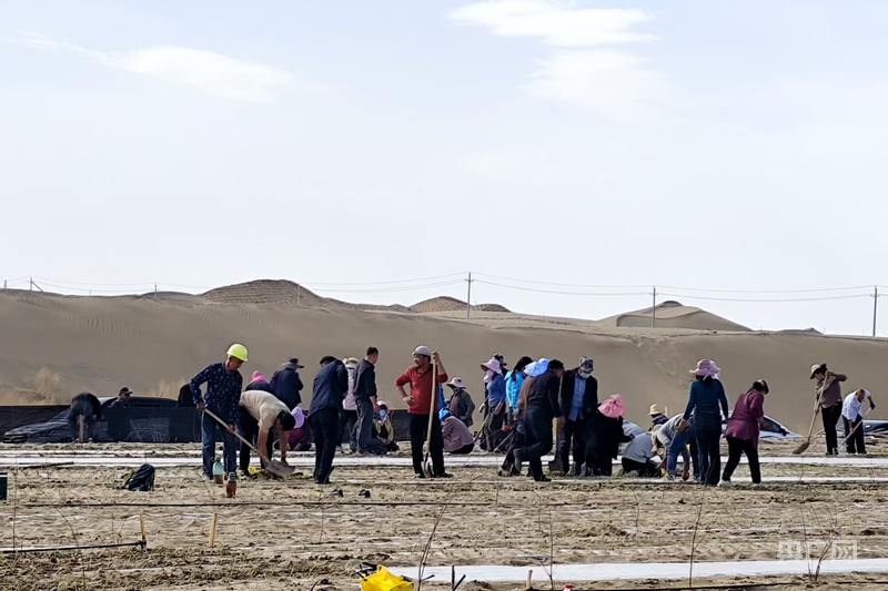 在民豐縣防沙治沙試驗站,林草技術(shù)中心的技術(shù)人員與護林員協(xié)作栽種耐旱中草藥苗 (央廣網(wǎng)發(fā) 馬曉杉 攝)