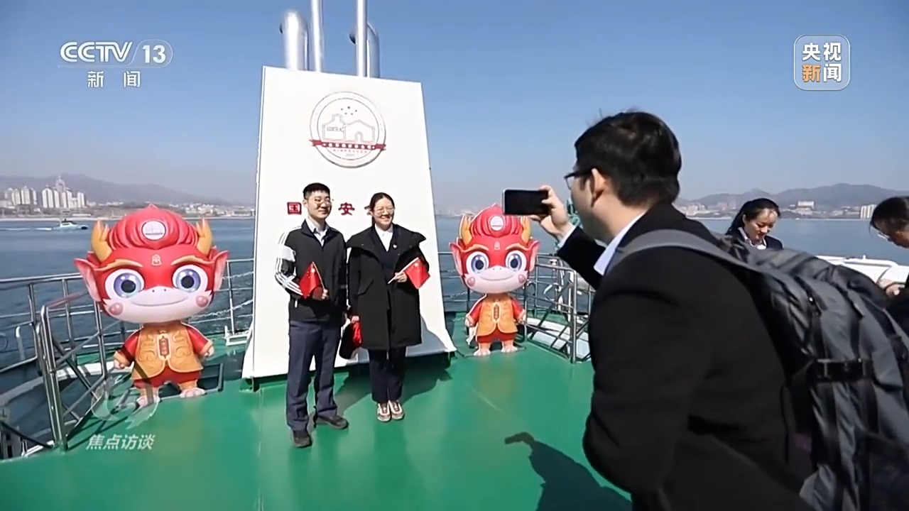 “國(guó)安號(hào)”上卡通形象“鳴銘”,取意國(guó)家安全要警鐘長(zhǎng)鳴、銘記在心之意,年輕人都喜歡在這里拍照。
