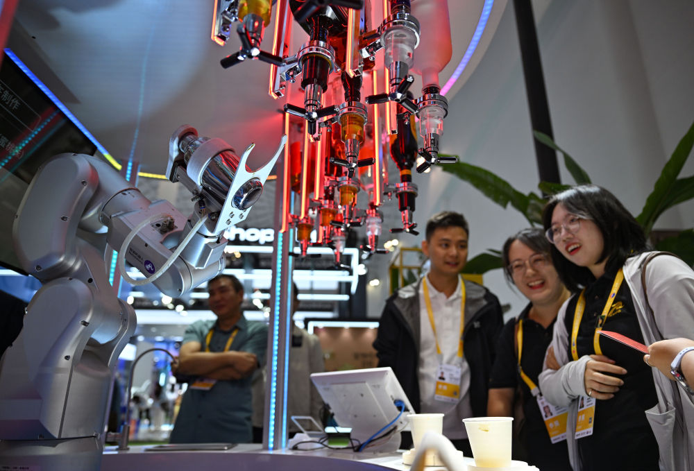 4月14日,消博會上展示的一款機器人在調(diào)酒。
