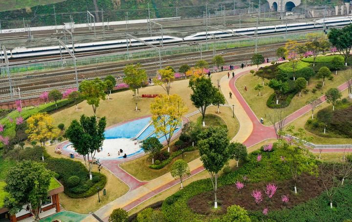陽春三月、百花爭(zhēng)艷,兩江新區(qū)木桃路社區(qū)公園因靠近鐵路,形成了“開往春天的列車”的獨(dú)特景觀,引來不少市民拍照?!斑^去這里是個(gè)建筑棄渣場(chǎng),社區(qū)周邊沒有休閑的地方。經(jīng)改造變成了高低錯(cuò)落的山地公園,兒童樂園、健身步道、飲水等設(shè)施都有,我們現(xiàn)在散步健身有了好地方?!弊≡诟浇泥u女士滿意地說。