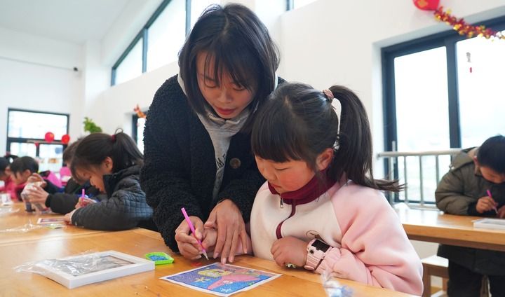 2月21日,重慶市豐都縣包鸞鎮(zhèn)“鸞媽媽”青少年家庭教育互助會(huì)志愿者在輔導(dǎo)孩子制作鉆石畫。豐都縣委宣傳部提供。
