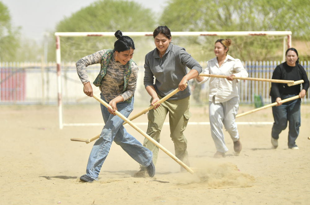 達里雅布依鄉(xiāng)女子麥熱球隊的訓練場地,就是一片被胡楊、紅柳包圍著的沙地操場。麥熱球類似曲棍球,是一種在新疆和田地區(qū)廣泛流行的古老運動。這項群眾性運動并沒有過于嚴格的規(guī)則,一片空地,三五好友,興之所起,即可揮桿。2021年,麥熱球被正式列入國家級非物質文化遺產(chǎn)代表性項目名錄。