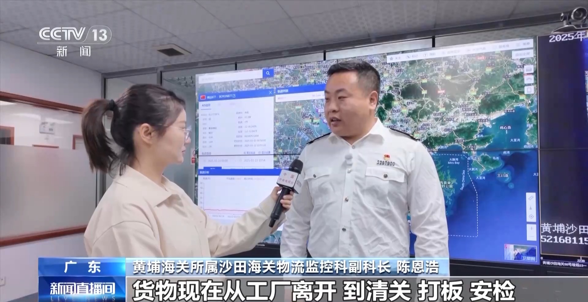 黃埔海關(guān)所屬沙田海關(guān)物流監(jiān)控科副科長(zhǎng) 陳恩浩:貨物現(xiàn)在從工廠離開(kāi),到清關(guān)、打板、安檢、裝船以及發(fā)運(yùn)整個(gè)環(huán)節(jié),最快可以在14個(gè)小時(shí)內(nèi)完成。我們還在不斷優(yōu)化流程、提高效率,未來(lái)預(yù)計(jì)還可以節(jié)約2到3小時(shí)。