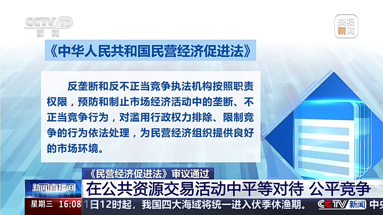 據(jù)楊合慶介紹,民營(yíng)經(jīng)濟(jì)促進(jìn)法在保障公平競(jìng)爭(zhēng)方面,完善了民營(yíng)經(jīng)濟(jì)組織市場(chǎng)準(zhǔn)入領(lǐng)域公平參與市場(chǎng)競(jìng)爭(zhēng)的制度機(jī)制,把實(shí)踐中行之有效的政策和做法確定為法律制度。