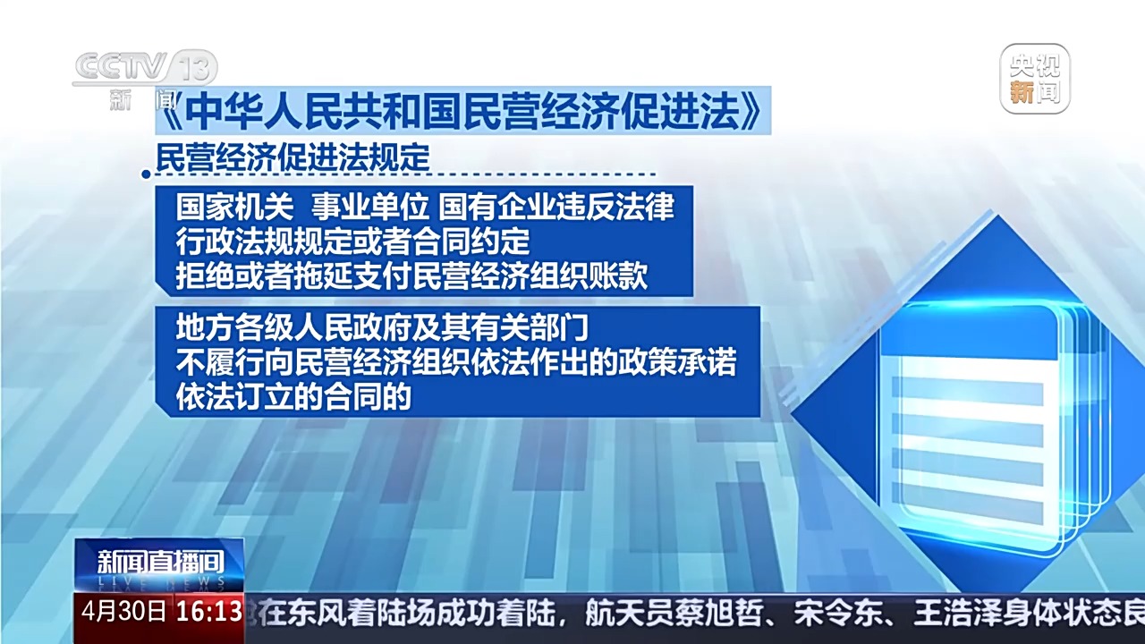 全國(guó)人大常委會(huì)法工委經(jīng)濟(jì)法室主任 楊合慶:制定民營(yíng)經(jīng)濟(jì)促進(jìn)法,第一次將“毫不動(dòng)搖鞏固和發(fā)展公有制經(jīng)濟(jì),毫不動(dòng)搖鼓勵(lì)、支持、引導(dǎo)非公有制經(jīng)濟(jì)發(fā)展”“促進(jìn)民營(yíng)經(jīng)濟(jì)健康發(fā)展和民營(yíng)經(jīng)濟(jì)人士健康成長(zhǎng)”寫入法律,第一次明確民營(yíng)經(jīng)濟(jì)的法律地位,第一次明確規(guī)定促進(jìn)民營(yíng)經(jīng)濟(jì)持續(xù)、健康、高質(zhì)量發(fā)展,是國(guó)家長(zhǎng)期堅(jiān)持的重大方針政策。