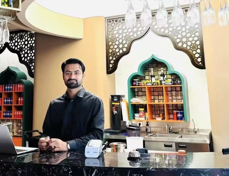 我們?cè)谥袊?guó)的網(wǎng)絡(luò)平臺(tái)上都會(huì)發(fā)送電子優(yōu)惠券,也有一些排行榜把我們店放上去,所以中國(guó)消費(fèi)者就會(huì)特意過(guò)來(lái)嘗試。我們有時(shí)也有學(xué)生折扣、會(huì)員卡的活動(dòng)。得益于中國(guó)的‘過(guò)境免簽’政策,我們店里有了更多的外國(guó)游客,一些外國(guó)游客可能不會(huì)用電子優(yōu)惠券,我們也有一些實(shí)體店的優(yōu)惠活動(dòng)。最近中國(guó)的一些‘促消費(fèi)’活動(dòng)我們也參加了,比如在美食節(jié)攤位上展示巴基斯坦美食,讓大家都嘗嘗。對(duì)于我們來(lái)說(shuō),不僅僅宣傳了我們的美食,還可以宣傳巴基斯坦文化?,F(xiàn)在我們?cè)诔啥紕傞_(kāi)了一家新店,未來(lái)我們還想在西安也開(kāi)一家。