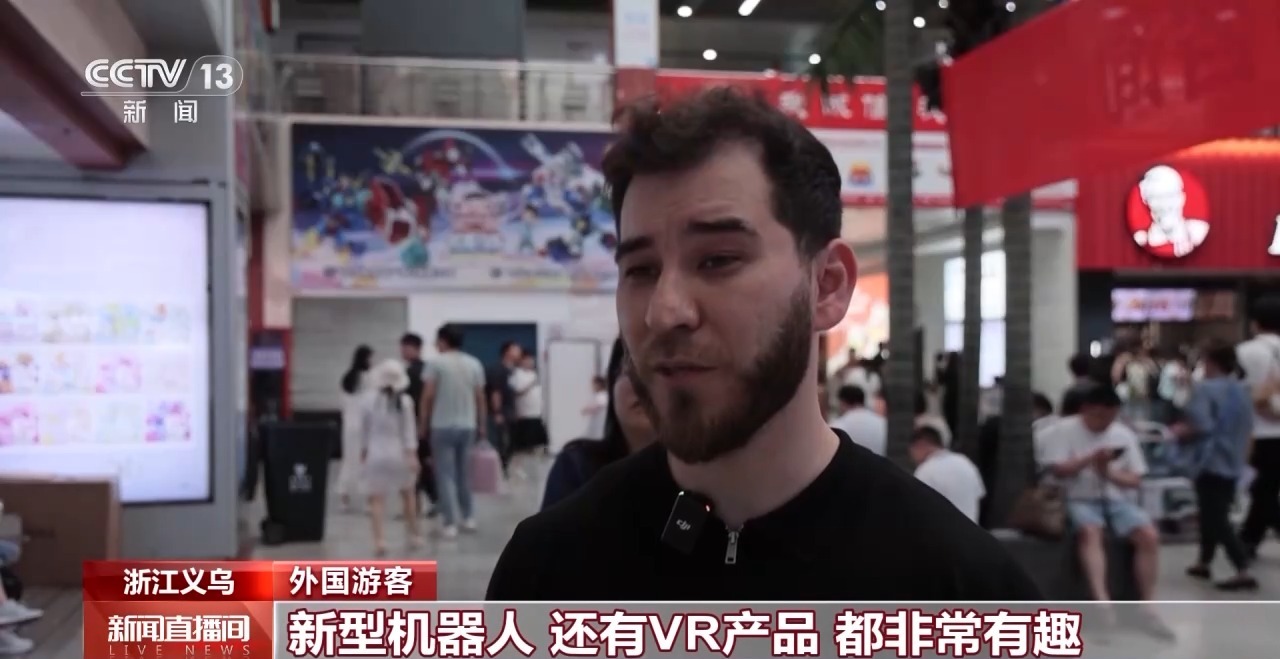 外國(guó)游客:我的朋友們是第一次來(lái)義烏,他們都很喜歡義烏,因?yàn)檫@里的產(chǎn)品都很有意思,吃住也都很舒適。我們剛剛在體驗(yàn)AR產(chǎn)品、新型機(jī)器人、VR產(chǎn)品,都非常有趣。