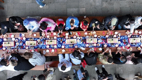 因?yàn)殡娪啊赌倪?》而火爆“出圈”的貴陽(yáng)越界影城,經(jīng)常舉辦“花式寵粉”的活動(dòng)。比如在影城門口擺起具有當(dāng)?shù)靥厣摹敖z娃娃”長(zhǎng)桌宴。