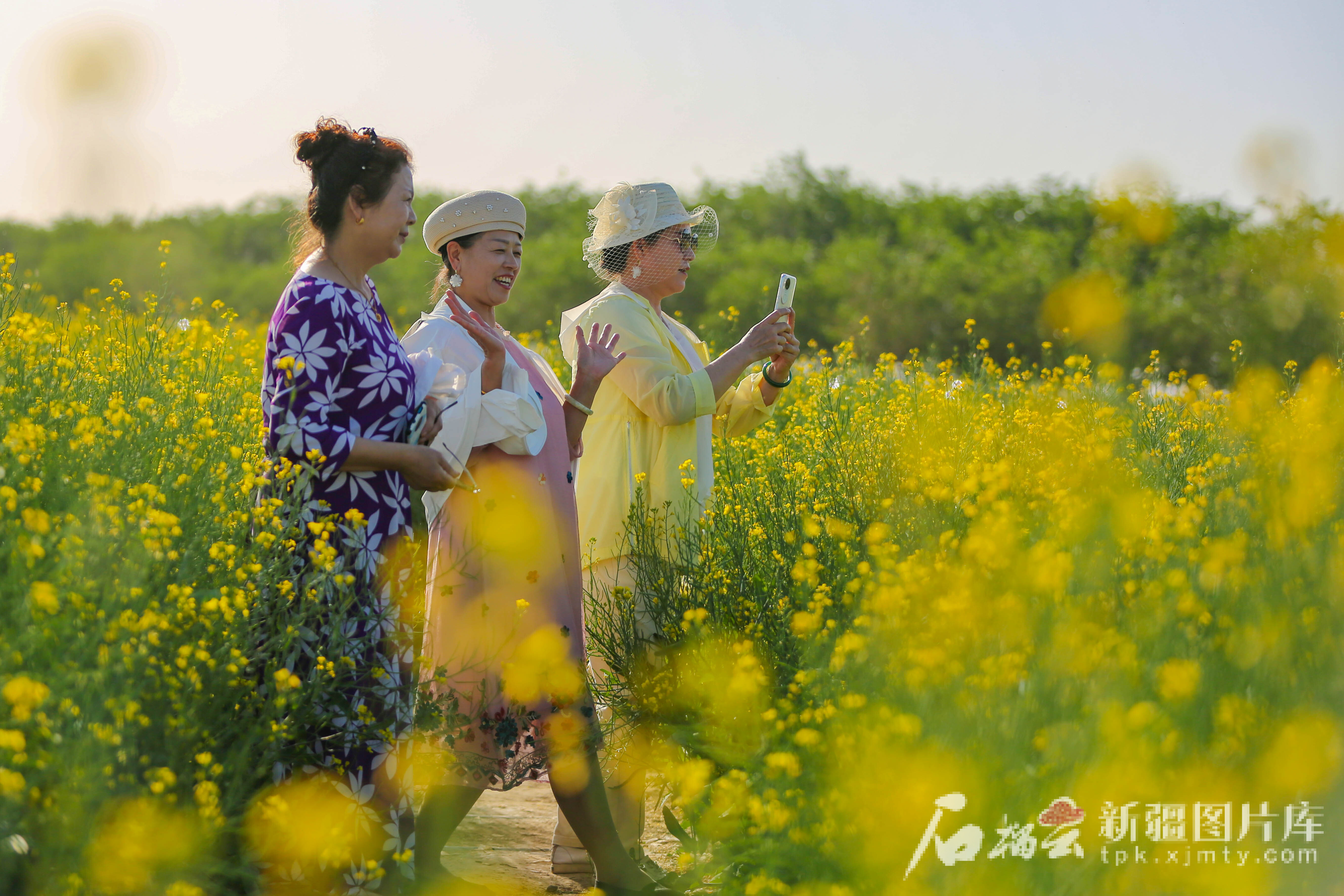 5月9日,游客在昌吉市六工鎮(zhèn)十三戶村千畝油菜花田景區(qū)拍照。