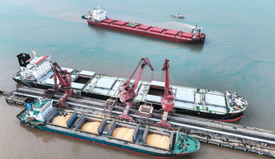圖為4月24日,一艘滿載巴西大豆的散貨船駛?cè)雽幉ㄖ凵礁劾咸辽阶鳂I(yè)區(qū),靠泊該港區(qū)三期1號(hào)泊位。姚峰攝(人民視覺)