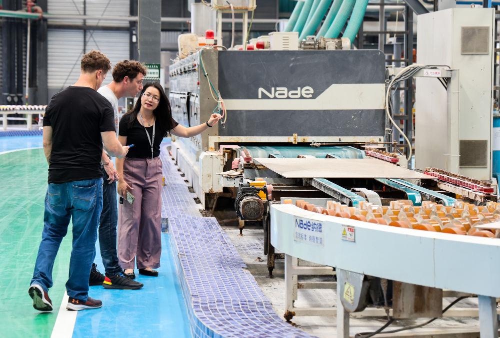 2025年4月22日,兩名參加廣交會(huì)的阿根廷采購(gòu)商專程來到佛山參觀蒙娜麗莎大尺寸陶瓷巖板自動(dòng)生產(chǎn)線。新華社記者 劉大偉 攝