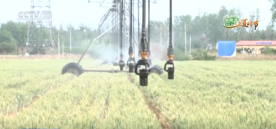 在侯馬市,大型自走式噴灌機(jī)沿著軌道勻速前行,精準(zhǔn)噴灑水霧,高效應(yīng)對(duì)干熱風(fēng)。