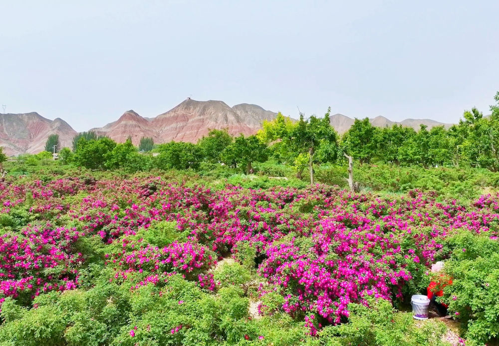 每年春末夏初,大片大片的玫瑰花,一團團一簇簇,盛開得像一幅油畫,鋪陳在苦水鎮(zhèn)干枯的溝梁間。整個小鎮(zhèn)沐浴著花香,寫意又嫵媚,盡情展示大西北一年之中最動人最美麗的時刻。