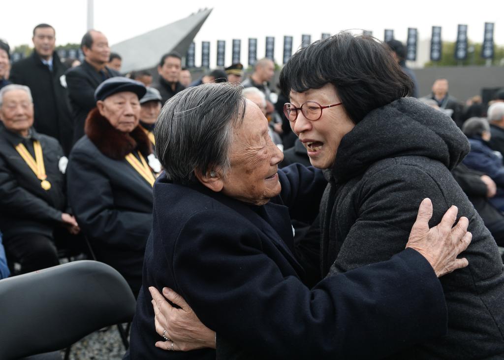 ↑2017年12月13日,南京大屠殺死難者國(guó)家公祭儀式開(kāi)始前,夏淑琴與日本友人松岡環(huán)(右)擁抱交流。