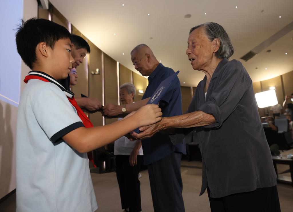 ↑2022年8月15日,在侵華日軍南京大屠殺遇難同胞紀(jì)念館,夏淑琴(右一)向曾外孫李玉瀚頒發(fā)“南京大屠殺歷史記憶傳承人”證書(shū)。新華社發(fā)