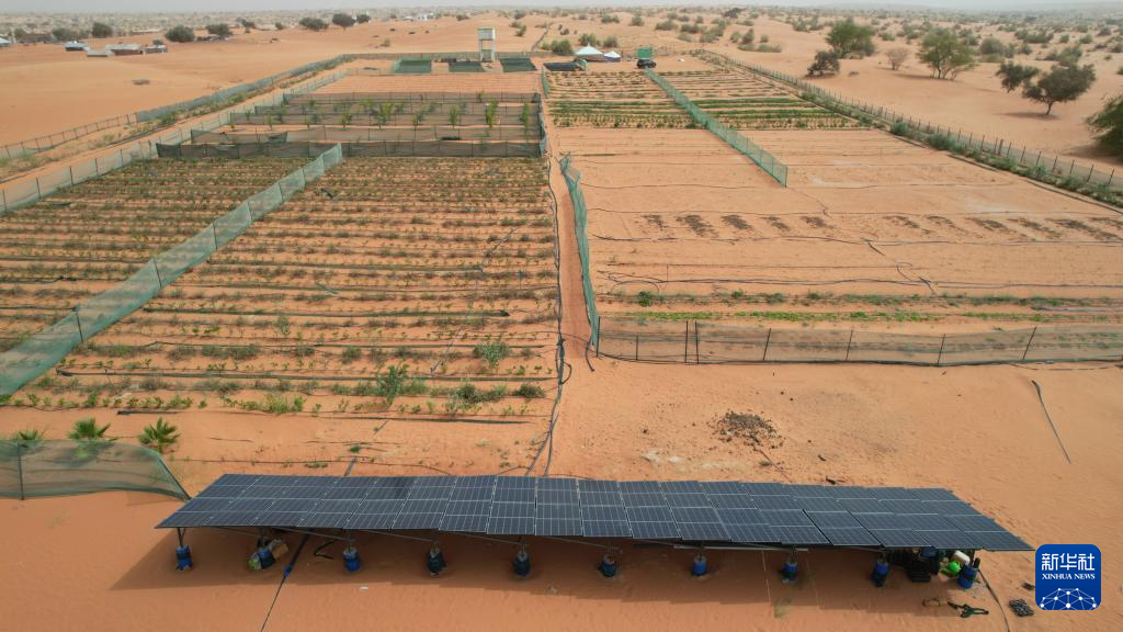 頭頂驕陽,腳踩熱沙,在毛里塔尼亞西部特拉扎區(qū)比爾·巴爾卡村沙地上,一排排滴灌管線沿著整齊壟溝延伸,嫩綠的果蔬苗從黃色沙土中破土而出。一旁的太陽能板正源源不斷將光能轉(zhuǎn)化為電力,驅(qū)動(dòng)水泵將地下水送至田間。放眼望去,昔日寸草不生的荒漠,如今分區(qū)布設(shè)、綠意漸起,一幅沙漠變綠洲的畫卷正悄然展開。
