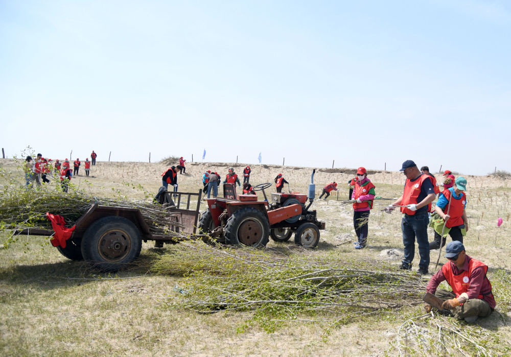 人們在地處渾善達(dá)克沙地的正藍(lán)旗寶紹岱蘇木開展植綠活動。新華社 發(fā)