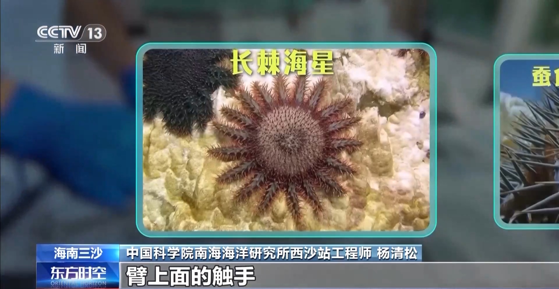 中國(guó)科學(xué)院南海海洋研究所西沙站工程師 楊清松:這個(gè)海星有十幾只臂,臂上面的觸手,它會(huì)伸出來,它把它的胃整個(gè)排出來,把珊瑚包裹住,把整個(gè)珊瑚的組織給消化掉,只剩骨骼了,這個(gè)跟珊瑚白化不一樣,吃掉就沒辦法了。