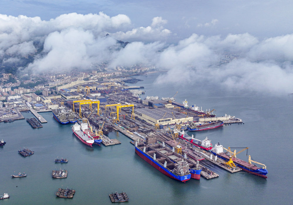 5月8日拍攝的山東省榮成市石島管理區(qū)修造船產(chǎn)業(yè)基地船塢(無人機照片)。新華社發(fā)(李信君攝)
