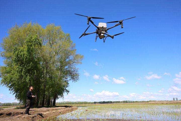 2025年5月21日,在北大荒集團(tuán)黑龍江綏濱農(nóng)場有限公司東井管理區(qū),操作員操控搭載北斗導(dǎo)航系統(tǒng)的植保無人機(jī),對即將施返青肥的地塊進(jìn)行打點(diǎn)。新華社發(fā)(李興攝)