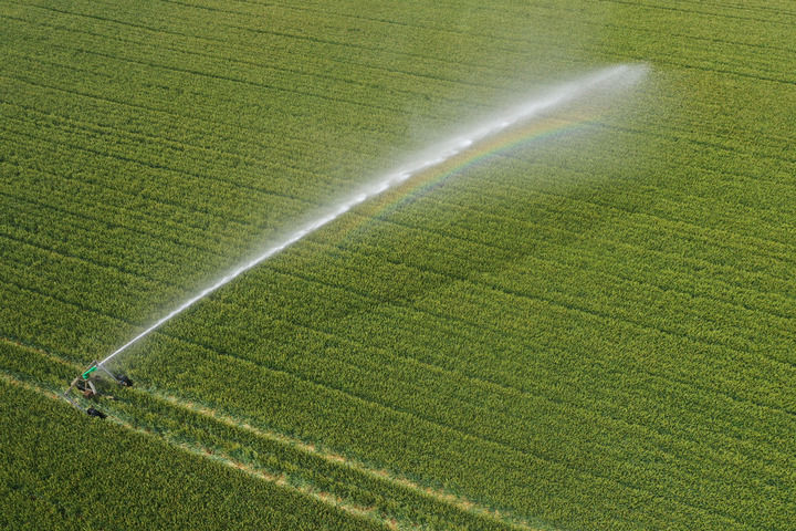 2025年5月7日,一臺自走式噴灌機(jī)在河南省焦作市溫縣黃莊鎮(zhèn)南韓村麥田間作業(yè)(無人機(jī)照片)。新華社發(fā)(徐宏星攝)