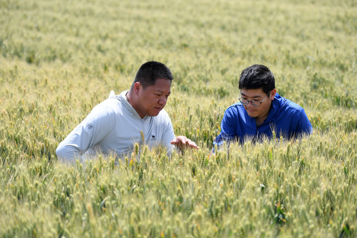 賈俊杰(左)和農(nóng)業(yè)技術(shù)員在山西運(yùn)城永濟(jì)市虞鄉(xiāng)鎮(zhèn)麥田里查看小麥生長情況(2025年5月21日攝)。新華社發(fā)(薛俊攝)