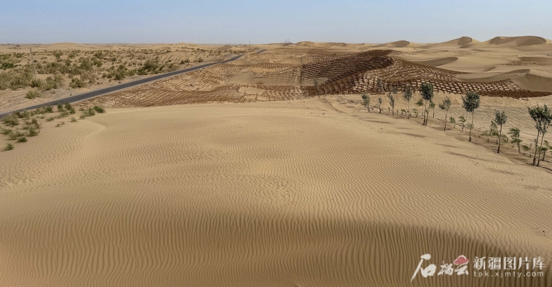 6月13日,在且末縣防風(fēng)治沙基地,一株株紅柳、梭梭及草方格守護著沙海。