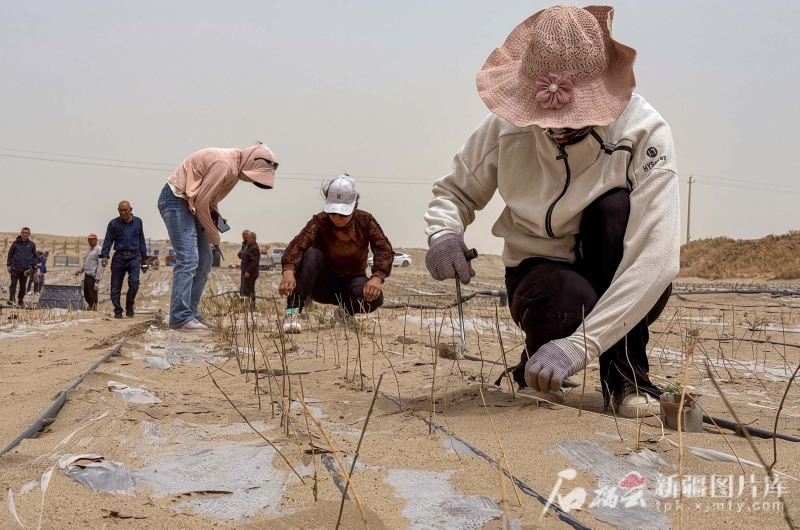 6月13日,在唐農(nóng)萬物(且末)生態(tài)科技有限公司實驗示范基地,工人在補植蛋白桑。