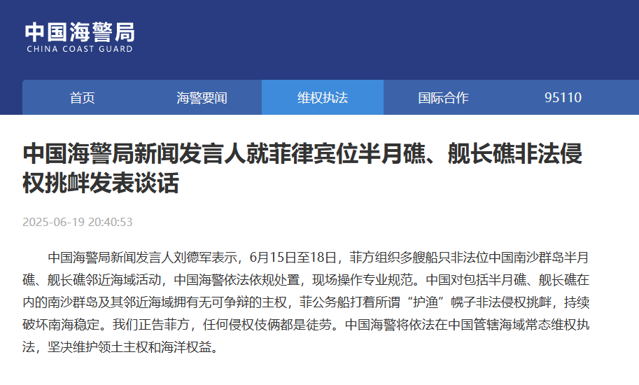 中國海警局新聞發(fā)言人劉德軍表示,6月15日至18日,菲方組織多艘船只非法位中國南沙群島半月礁、艦長礁鄰近海域活動,中國海警依法依規(guī)處置,現(xiàn)場操作專業(yè)規(guī)范。中國對包括半月礁、艦長礁在內(nèi)的南沙群島及其鄰近海域擁有無可爭辯的主權(quán),菲公務(wù)船打著所謂“護(hù)漁”幌子非法侵權(quán)挑釁,持續(xù)破壞南海穩(wěn)定。我們正告菲方,任何侵權(quán)伎倆都是徒勞。中國海警將依法在中國管轄海域常態(tài)維權(quán)執(zhí)法,堅決維護(hù)領(lǐng)土主權(quán)和海洋權(quán)益。