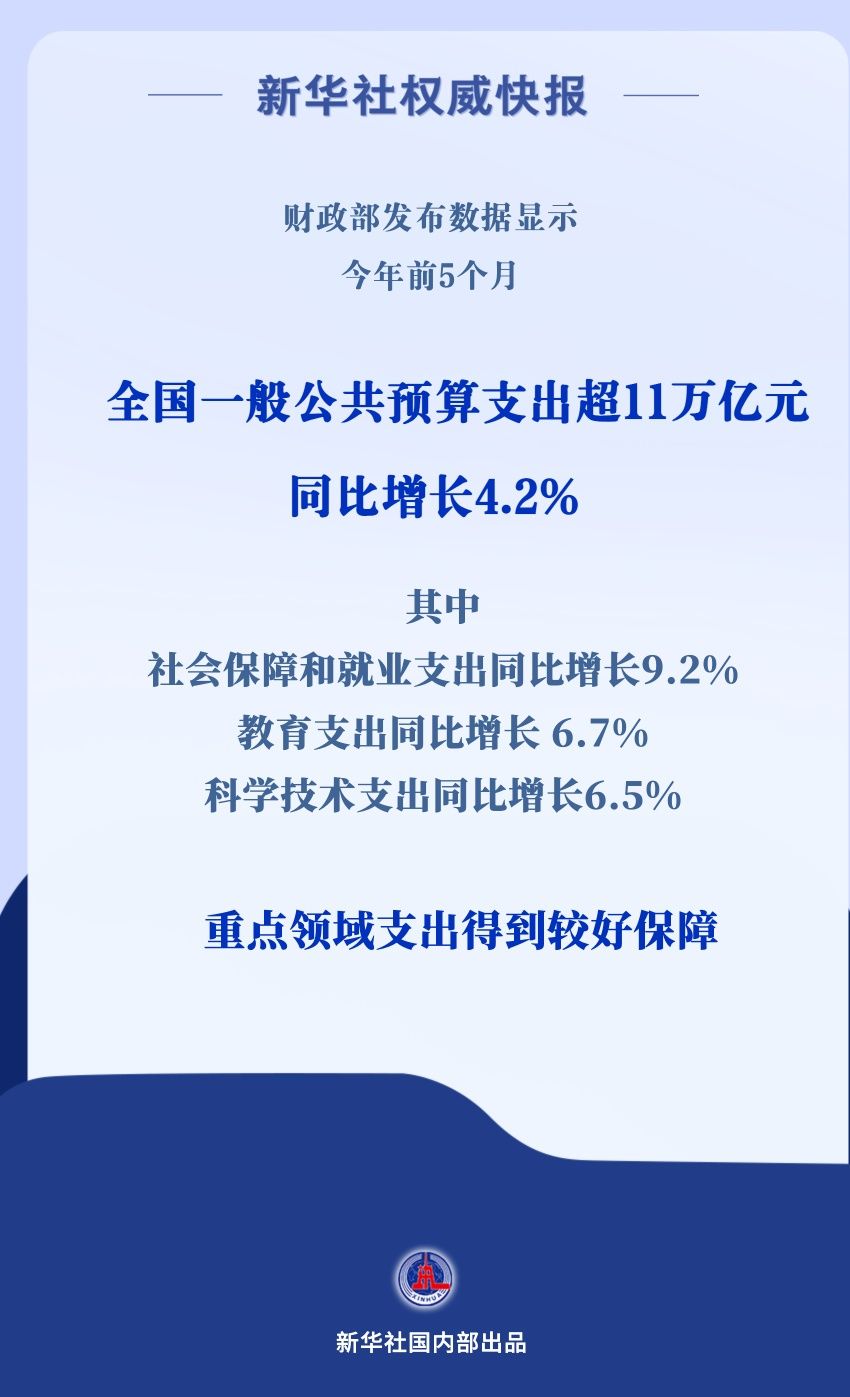 數(shù)據(jù)顯示,全國(guó)一般公共預(yù)算支出持續(xù)增長(zhǎng),前5個(gè)月達(dá)112953億元,同比增長(zhǎng)4.2%。各級(jí)財(cái)政部門加大支出強(qiáng)度,優(yōu)化支出結(jié)構(gòu),持續(xù)加強(qiáng)對(duì)重點(diǎn)領(lǐng)域的支出保障。