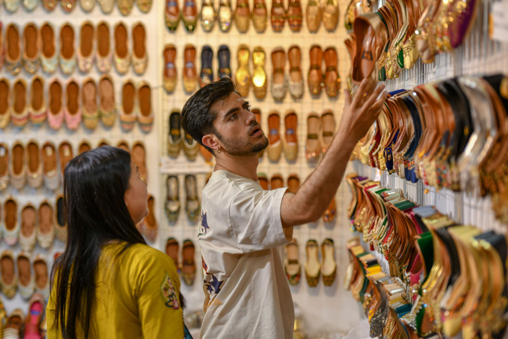 2025年6月19日,在第9屆中國—南亞博覽會,巴基斯坦展區(qū)的參展商(右)向一名顧客推介特色鞋。新華社發(fā)(彭奕凱 攝)