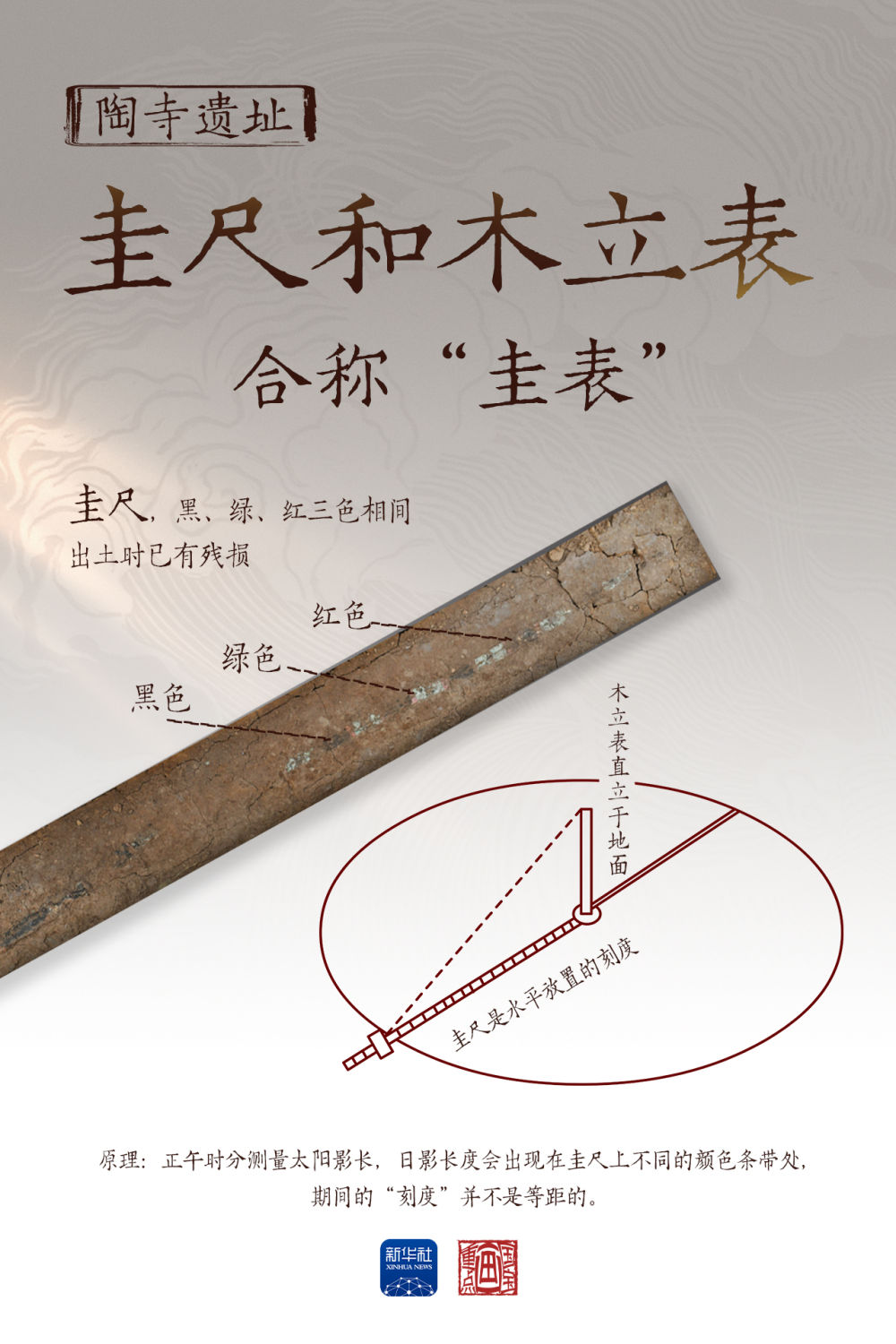 圭尺和木立表,是陶寺遺址出土的另外一件觀天象、授人時(shí)的文物,合稱“圭表”。木立表直立于地面,圭尺是水平放置的刻度。圭表測(cè)量太陽(yáng)影長(zhǎng),與觀象臺(tái)相輔相成,用于太陽(yáng)歷法的制定。黑、綠、紅三色相間的漆木桿“圭尺”,出土?xí)r已有殘損,殘長(zhǎng)171.8厘米,復(fù)原長(zhǎng)度187.5厘米。正午時(shí)刻,太陽(yáng)照在木立表上,投下的影子被圭尺上的刻度標(biāo)記出長(zhǎng)短。在夏至、春分和秋分,日影長(zhǎng)度會(huì)出現(xiàn)在圭尺上不同的顏色條帶處,期間的“刻度”并不是等距的。