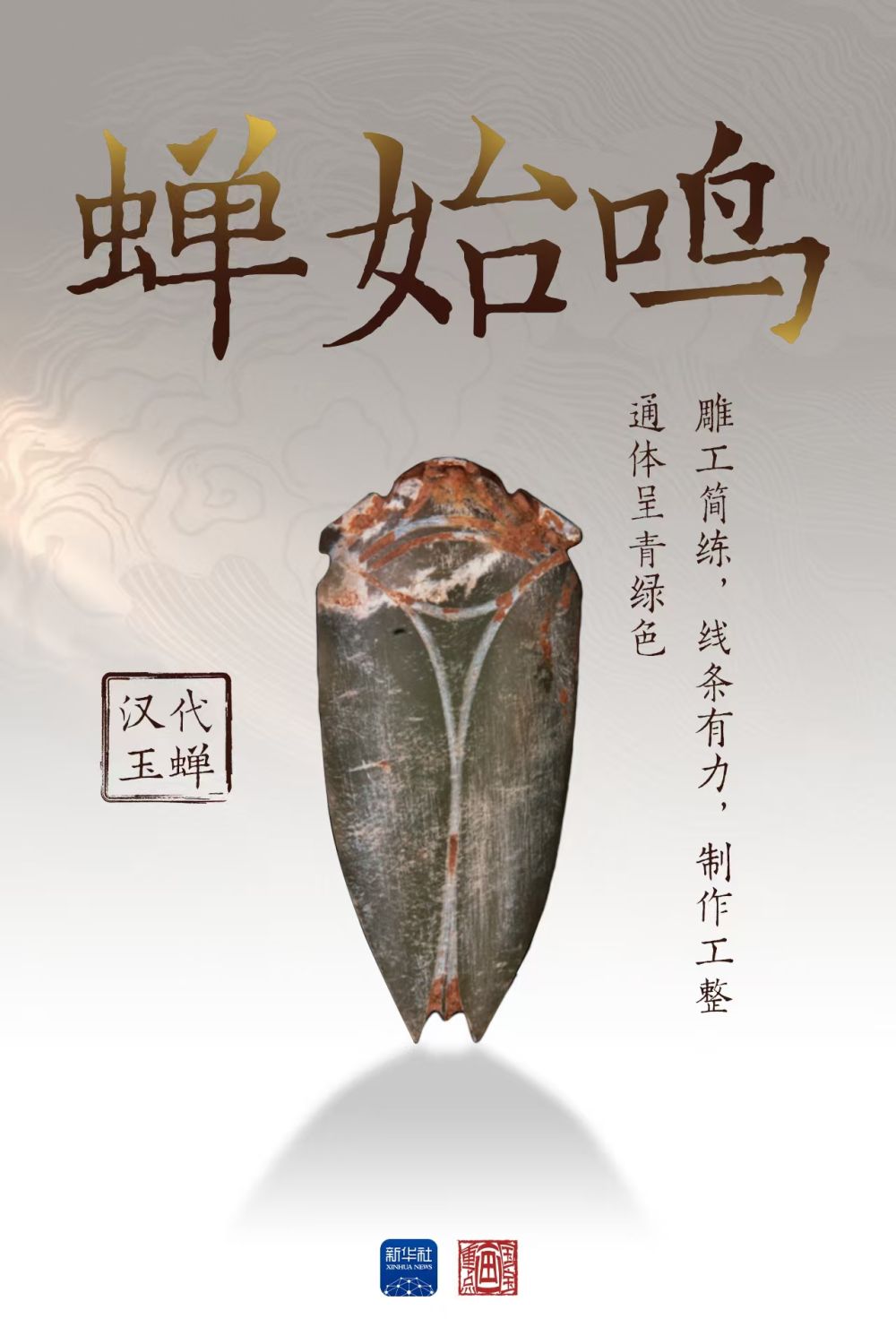 這件漢代玉蟬通體呈青綠色,盛夏的氣息撲面而來(lái)?!抖Y記·月令》記載:“仲夏之月,蟬始鳴”,古人發(fā)現(xiàn)夏至之日陽(yáng)氣達(dá)到極盛,蟄伏地底多年的蟬若蟲會(huì)破土羽化宣告盛夏來(lái)臨,這是自然界的昆蟲“節(jié)氣預(yù)報(bào)”。