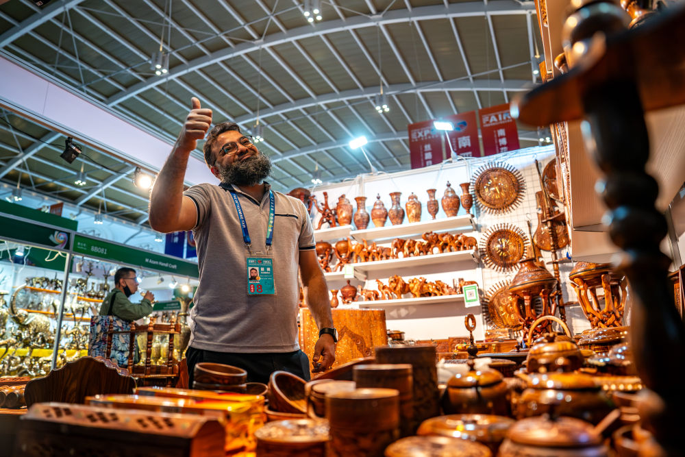 6月21日,第9屆中國—南亞博覽會南亞館巴基斯坦展區(qū)的參展商對觀眾比出大拇指。