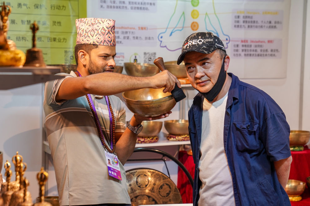 6月21日,顧客在南亞館尼泊爾展區(qū)體驗頌缽。