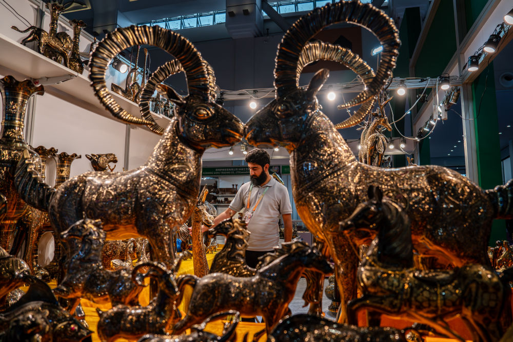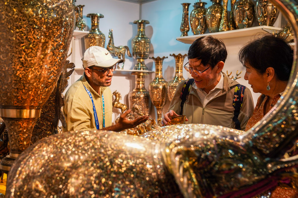 6月20日,顧客在南亞館巴基斯坦展區(qū)選購銅制工藝品。