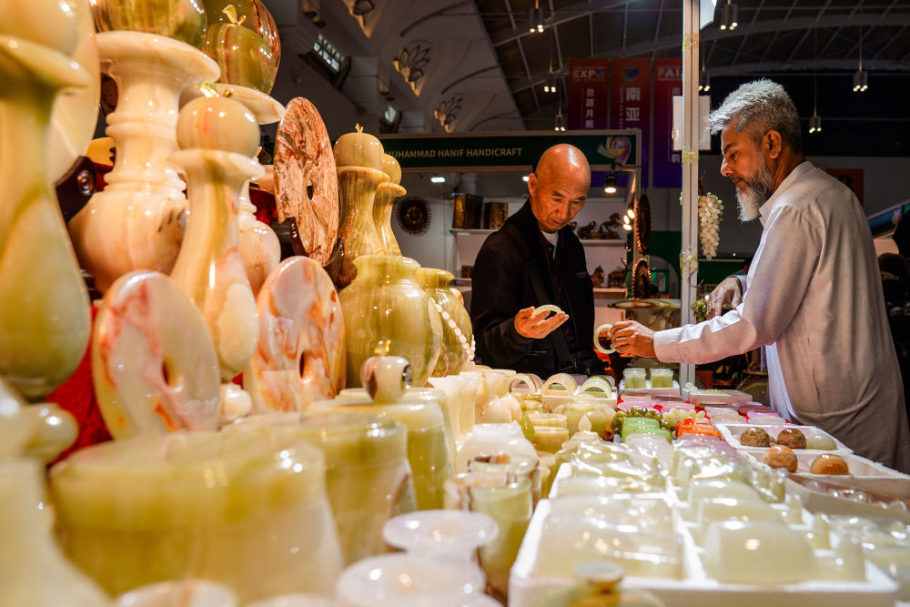 6月20日,顧客在南亞館巴基斯坦展區(qū)選購玉石工藝品。