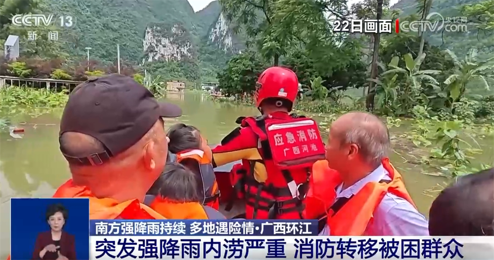 22日11時,廣西河池消防救援支隊指揮中心接到報警,環(huán)江毛南族自治縣水源鎮(zhèn)下南社區(qū)因強(qiáng)降雨發(fā)生內(nèi)澇,多名群眾被困。當(dāng)?shù)叵谰仍藛T隨即攜帶救援裝備趕到現(xiàn)場。由于積水嚴(yán)重,該村屯有道路被淹,最深處近4米,周邊有農(nóng)田被淹。通過詢問村民,消防救援人員了解到被困群眾中有老人和孩子。救援人員隨即乘坐橡皮艇進(jìn)入村子,逐戶搜救被困人員。經(jīng)過近3個小時的緊張救援,成功將17名被困人員轉(zhuǎn)移到安全地帶。