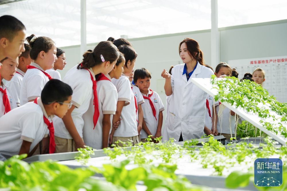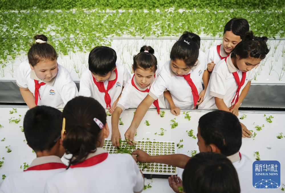 ↑ 6月25日,在新疆阿克蘇地區(qū)庫(kù)車市甬庫(kù)同心村智慧農(nóng)業(yè)植物工廠,當(dāng)?shù)匦W(xué)生體驗(yàn)無(wú)土栽培。