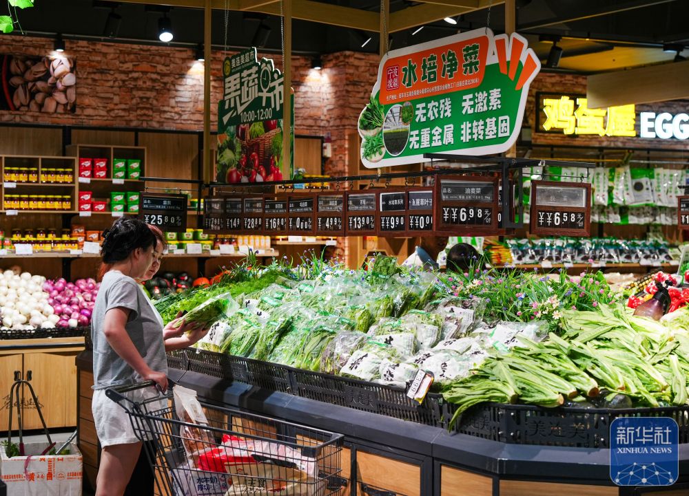 ↑ 6月25日,在新疆阿克蘇地區(qū)庫(kù)車市美連美超市,人們?cè)谶x購(gòu)甬庫(kù)同心村智慧農(nóng)業(yè)植物工廠的農(nóng)產(chǎn)品。