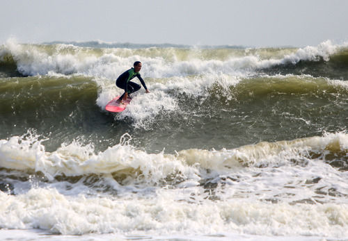 一名沖浪運動員在“逐浪前行”。(陳史攝)