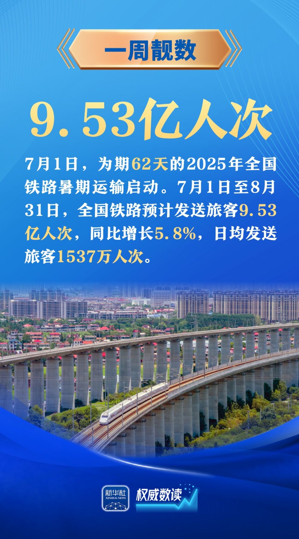 今年“暑運”期間全國鐵路預(yù)計發(fā)送旅客9.53億人次;今年8000億元“兩重”建設(shè)項目清單已全部下達(dá)完畢;前5個月我國規(guī)上互聯(lián)網(wǎng)企業(yè)完成互聯(lián)網(wǎng)業(yè)務(wù)收入7735億元……本周這些“靚”數(shù),值得關(guān)注。