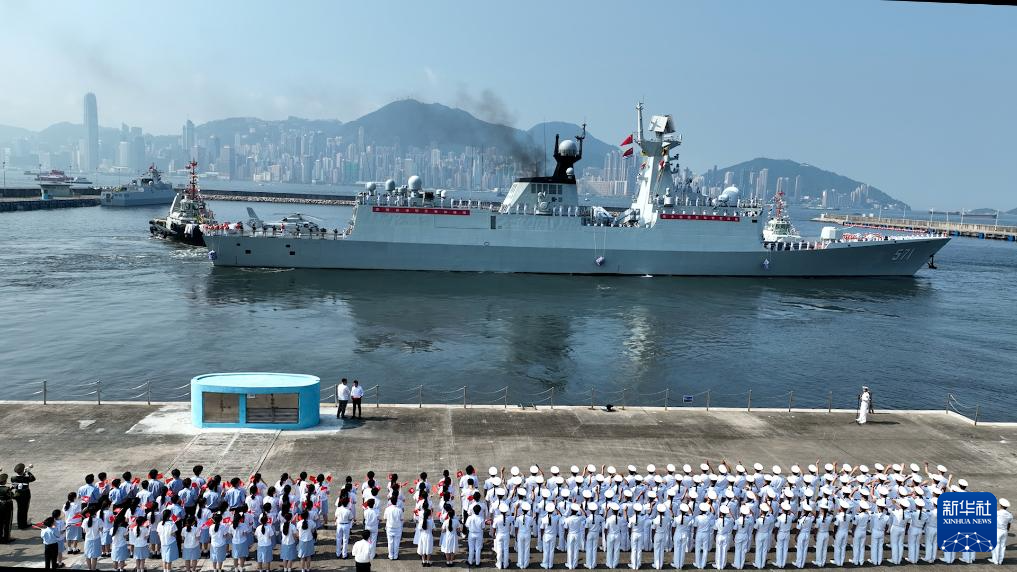 儀式結(jié)束后,湛江艦、運城艦響起清脆的海軍笛,官兵們在舷邊分區(qū)列隊,向碼頭上的人群揮手致意,兩艘艦艇駛離昂船洲軍營碼頭,前往預定海域與山東艦、延安艦會合。香港特區(qū)直升機、船隊一路引航伴航,護送編隊駛出區(qū)界。